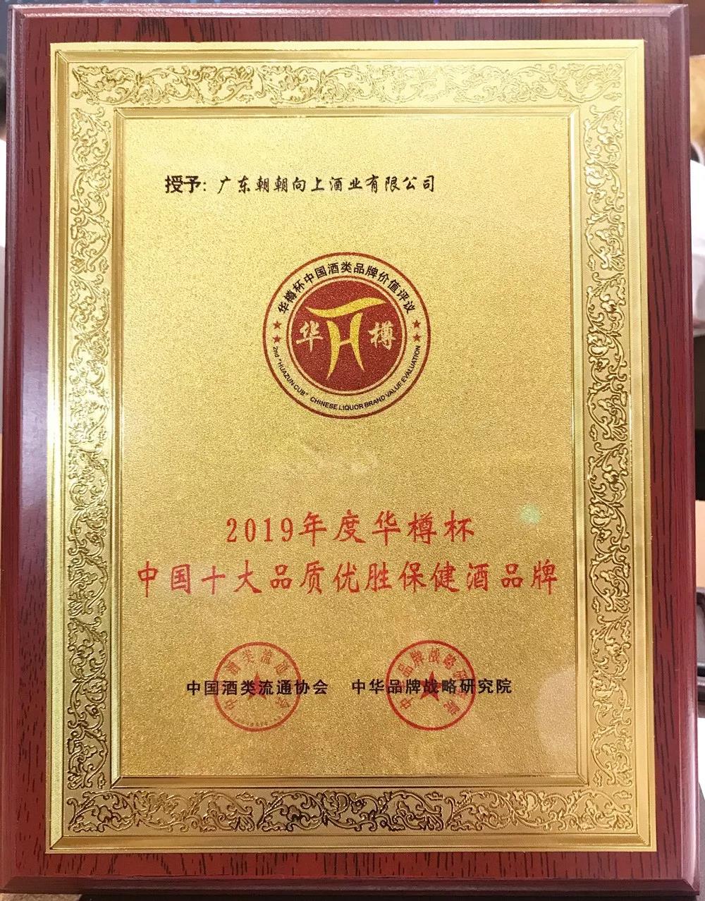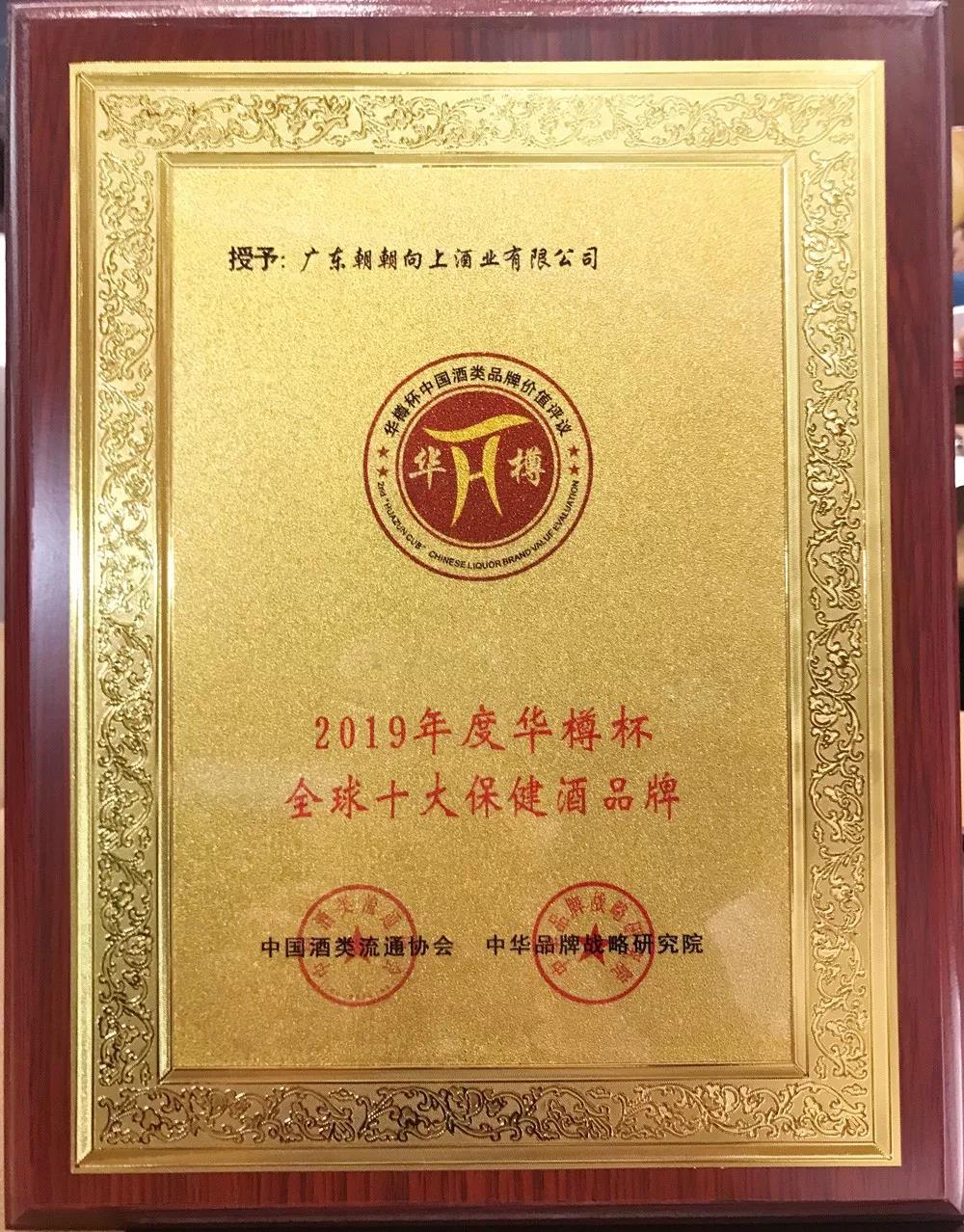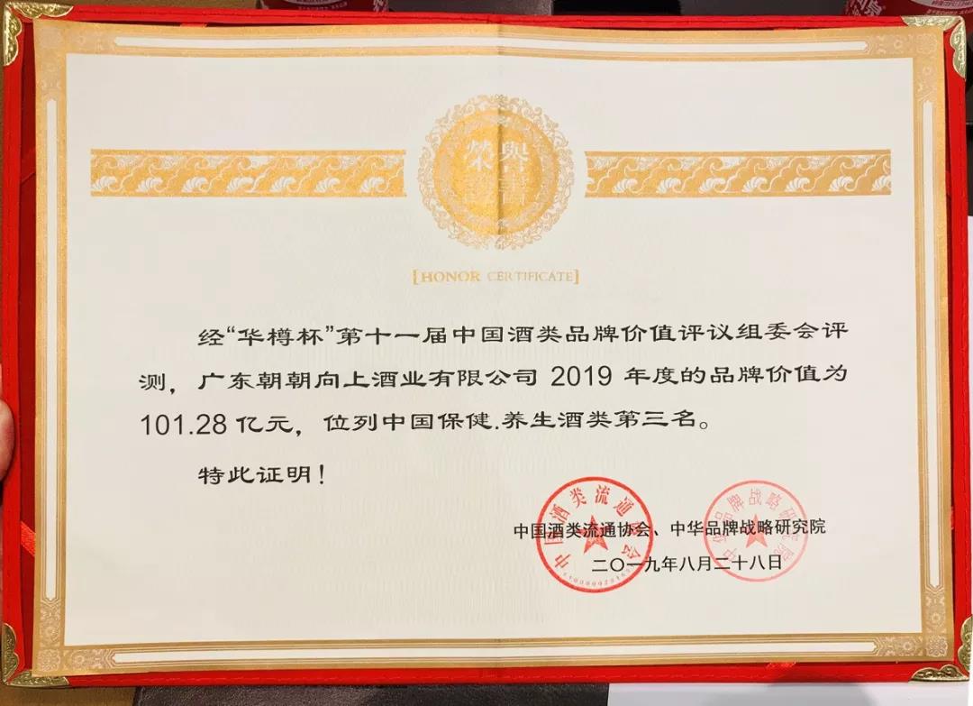 2019年8月28日,中国酒类流通协会联合中华品牌战略研究院在北京国家会议中心举办了第十一届中国酒类企业品牌价值200强暨第二届全球酒类产品品牌价值100强颁奖盛典。活动上,“华樽杯”组委会公布了中国酒类品牌价值200强名单,并且再次发布全球酒类产品品牌价值100强名单。其中,“朝朝向上”2019年品牌价值达101.28亿元,稳居广东省养生、保健酒类第一名,全国同类酒第三名,并被评为“2019年度全球十大保健养生酒品牌”。此外,朝朝向上创始人叶锦福先生被授予“中国酒业十大年度人物”的荣誉称号,这也是朝朝向上创始人第五次获评该荣誉称号。